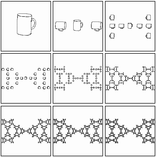 We started with a random set of points (here a picture of a coffee cup) and applied three linear